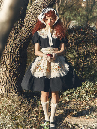 また「空想林檎楽園」シリーズのSP(スペシャル)アイテムは、北欧風の刺繍エプロンと4色ワンピースのセット。スカートはブラック/レッド/ピンク/サックスの4色バリエーションがあり、内側と外側をすべて純綿生地を採用しています。エプロンはボタン式でウエストバンドに固定する形で、取り外しも可能です。