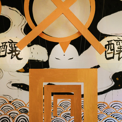 その2つの作品展での創作において、私は「生まれ暮らした土地に立ち返る」という文化的な観点から、作画を伝統的絵の具の墨汁と顔彩などを採用して作品制作を試みました。もう1つの理由を説明しますと「世間で常識的に認定する表現手法」とわざと離れて、自分らしく斬新さがある表現手法に挑戦する意味も込めています。