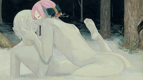 「光栄なお言葉を感謝致します。作品でテーマにしている事は自分の居る人の世とはまた別の人の世の文化です。僕はずっとファムファタールかつマリア的な存在を求めており自分と同じ本当の人間をモチーフに描いていてはそれにはあまりにも役不足だと感じていまして、人間の僕から見て人間のように見えるけど恐らく同じでは無く似て非なる倫理観や文化の元に穏やかに暮らす今の彼等の姿に至りました」