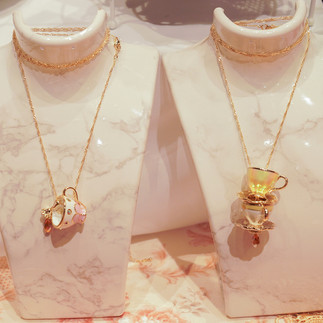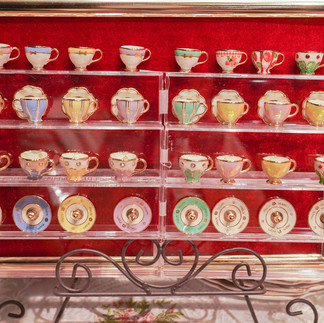 小さな化粧棚に整然と陳列された可愛いミニチュアのティーカップが目を惹く「Michael&Lisette」さん。一つ一つデザインや配色が違っていて驚きの精密さ。ティーカップの他スプーン&フォークやバラモチーフのピアスも上品な可愛さがあり注目です。