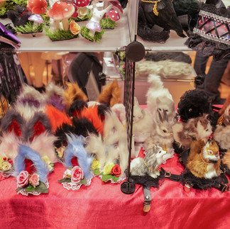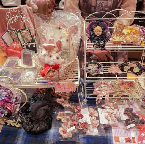 定番のリボンの他、動物や人形の顔をあしらったブローチが印象的な「InEden」さん。中国出身で日本在住12年になる出展者の吉倉さんにお話をお聞きしたところ、日本のロリータファッションは中国でも人気が高いとのこと。取材中にも中国人のお客さんが立ち寄っていて、海を超えたロリータファッションの広がりを実感します。