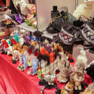 カラフルでキャッチーなアジアンテイスト小物が楽しい「MICHAEL3」さん。短い髪でも着けられるヘアアクセサリーを探求するうちに今のテイストに行き着いたとのこと。ブースではぬいぐるみに着せられる衣装や、着物をリメイクした衣装も販売していました。