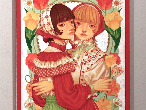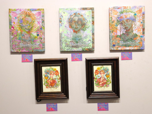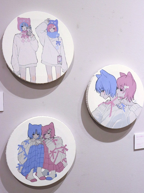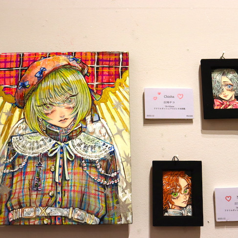 「慎さんは今回初参加の作家さんで、今回の展示で唯一の透明水彩の作品を展示してくださいました。若干、80〜90年代の少女漫画を思わせる世界観を残しつつも、令和ナイズされているキャラクターデザインの2つのバランスが取れていて素晴らしいなぁと思います。あとは額選びにも凄いこだわりを感じますね」