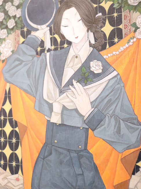 「布がキャンバスの前面に施されている構成ってなかなか珍しいと思います。この作品だけでアンティークとして成立するような、クオリティが毎回めちゃくちゃ高い…!あとはみかくさんには珍しく長髪の男の子が今回展示されています。みかくさんが特に絵が上手いなぁと思う部分は生物や花の表現です」
