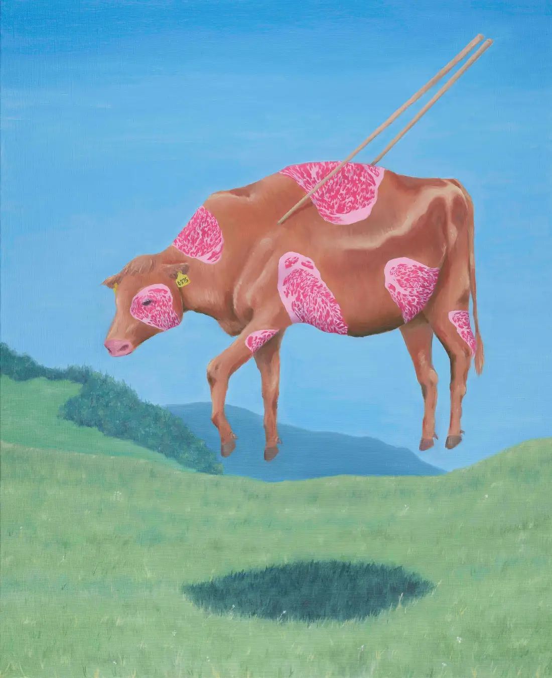 ここ最近生活している中で違和感を覚えることを、私が好きなモチーフである牛肉や牛などにのせて表現した。『ADME』というタイトルは、学生時代に薬物動態に関する研究をしていた私の経験にも重なるものがある。都市や社会は絶えず新陳代謝を続ける身体として、そして私たち一人一人はその身体を構成する細胞として捉えることができる。私たちは生まれた時から社会に属し、何をしても社会の一部であり続ける。アートは社会の不調に対して作者の心が動いたときにも生み出され、鑑賞者の心や頭になんらかの影響を与えることがある。薬物は体の不調を癒すために摂取され、吸収・代謝されていくが、アートもそんな薬のような存在となり得るだろうか。