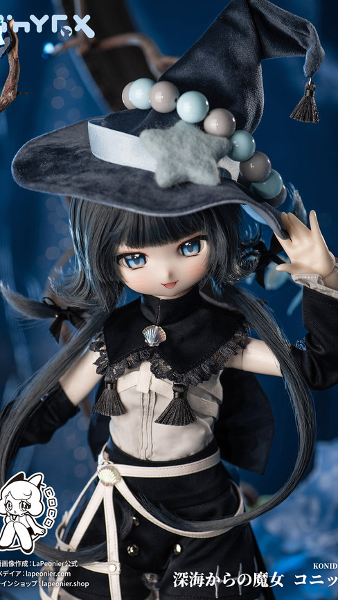 つばの広い三角帽子は、魔女である彼女の存在を静かに示し、深い青色の瞳は強い意志を映し出しています。黒に近い青紺色を基調としたモノトーンの配色に、貝殻の装飾が海の要素と魔女の気品を見事に統合します。裾にフリルをあしらったショートパンツが、洗練されたデザインに女性らしさを添えています。