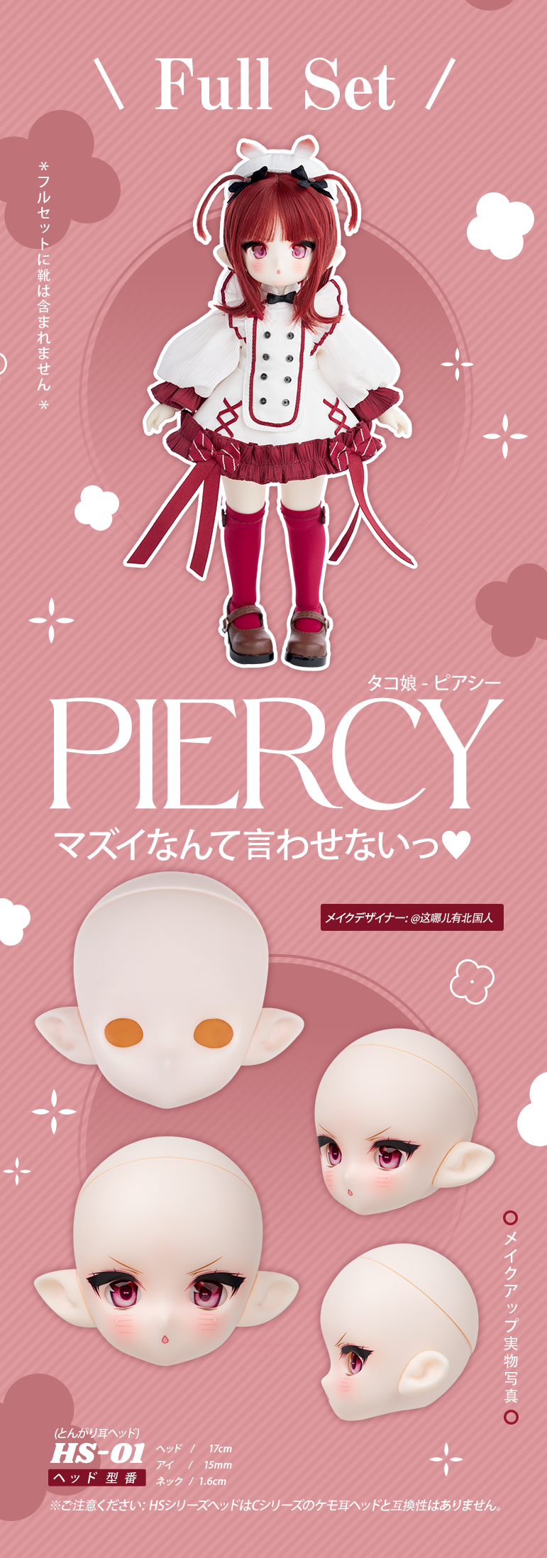 ピアシーは深紅色の瞳の大きな瞳、深紅ツインテールボブのウィッグそして深紅色の瞳。ちょっとドジっ子で、でもあきらめない一面も。でもこんなにかわいくて一生懸命なお料理だいすきっ娘。です。
